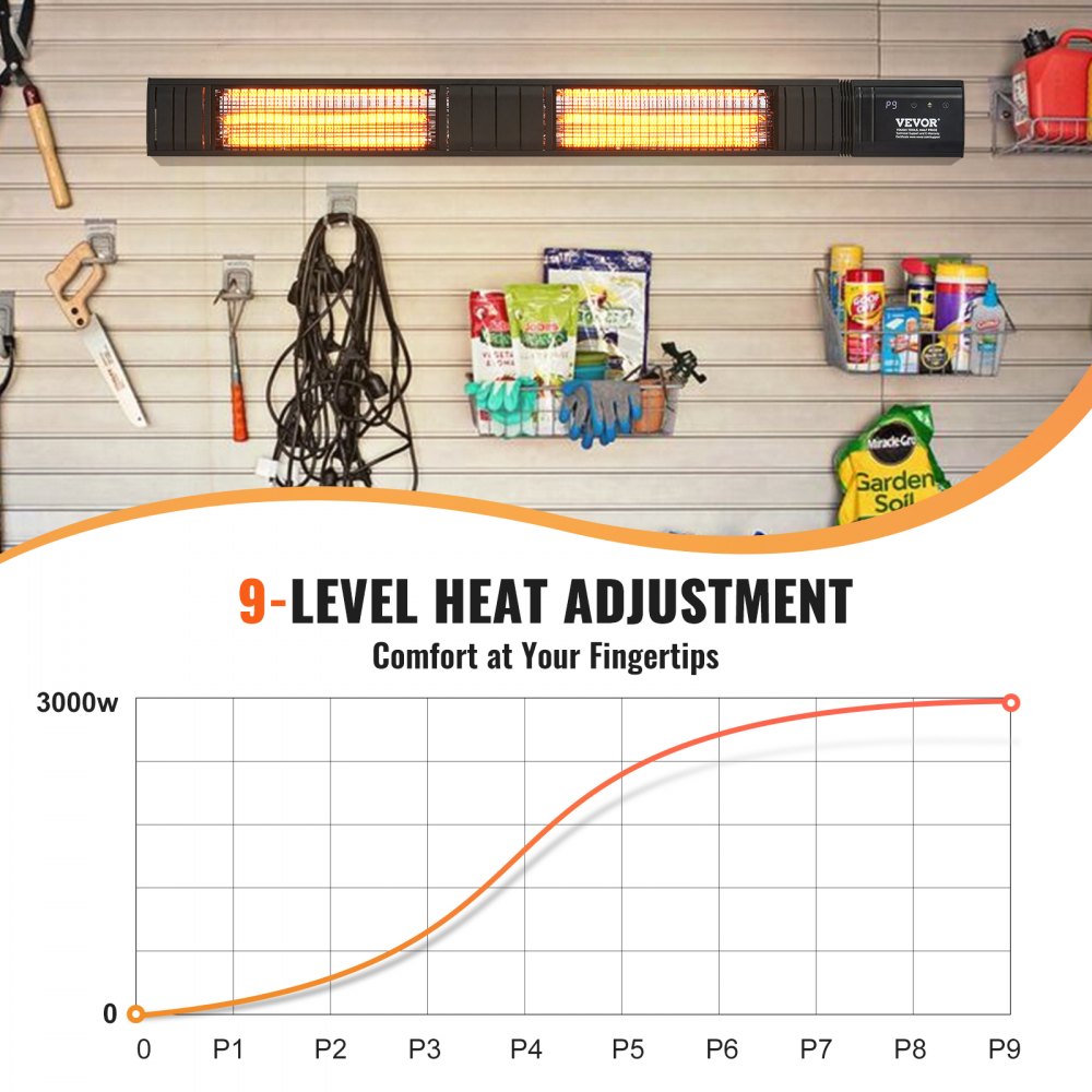Deväť nastaviteľných nastavení: S výkonom až 3000 W ponúka 9 nastavení teploty (333 W – 3000 W), ktoré vyhovujú rôznym úrovniam chladného počasia, a sú vhodné pre terasy, garáže a štúdiá.