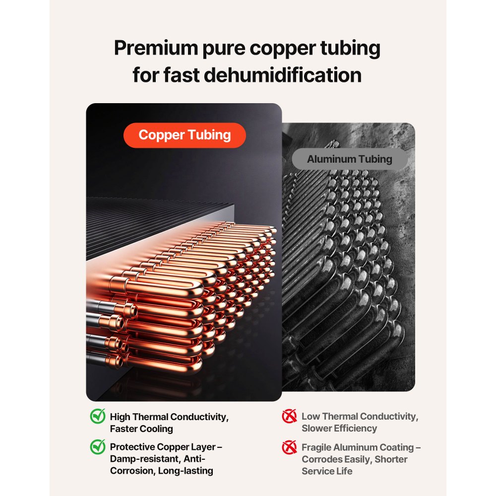 Medené rúrky na chladenie: V porovnaní s hliníkom zaisťuje čistý medený kondenzátor v tomto priemyselnom odvlhčovači rýchlejšie chladenie, rýchlejšie odsávanie vlhkosti, lepšiu odolnosť proti korózii a dlhšiu životnosť.