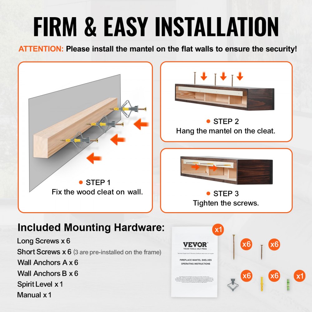 Jednoduchá inštalácia: Pre bezpečnú a jednoduchú inštaláciu sa uistite, že drevený krb je namontovaný na rovných stenách. Súčasťou balenia je všetok potrebný montážny materiál, vďaka čomu je montáž rýchla a bezproblémová.