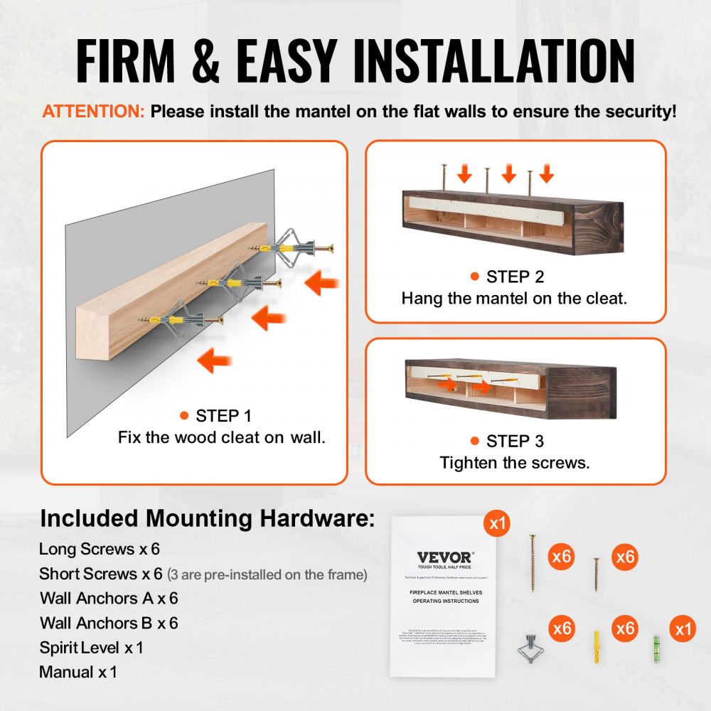 Jednoduchá inštalácia: Pre bezpečnú a jednoduchú inštaláciu sa uistite, že drevený krb je namontovaný na rovných stenách. Súčasťou balenia je všetok potrebný montážny materiál, vďaka čomu je montáž rýchla a bezproblémová.