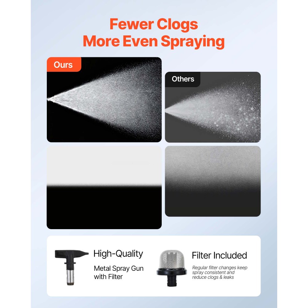 Ideálny povrch náteru: Prémiová tryska zaisťuje presné ovládanie a minimalizuje nadmerné striekanie. Náš bezvzduchový striekací stroj farby obsahuje filter a tesnenia, ktoré zabraňujú upchávaniu a únikom, čím sa zabezpečuje hladký a rovnomerný náter.