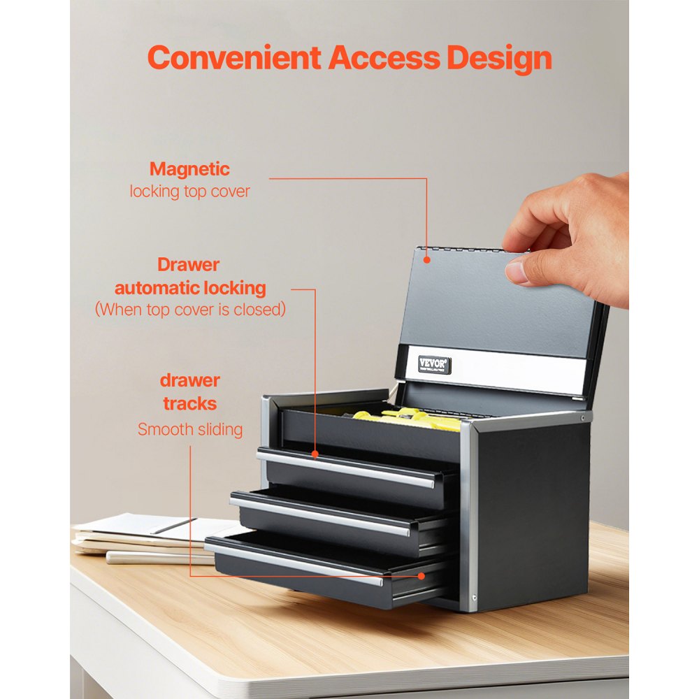 Kovová skrinka na náradie VEVOR, 8,6-palcová, prenosná kovová skrinka na náradie s 3 zásuvkami, malá skrinka na náradie s EVA vložkou a PP nožičkami, odolná oceľ s otváraním s guľôčkovým ložiskom a práškovou povrchovou úpravou, čierna
