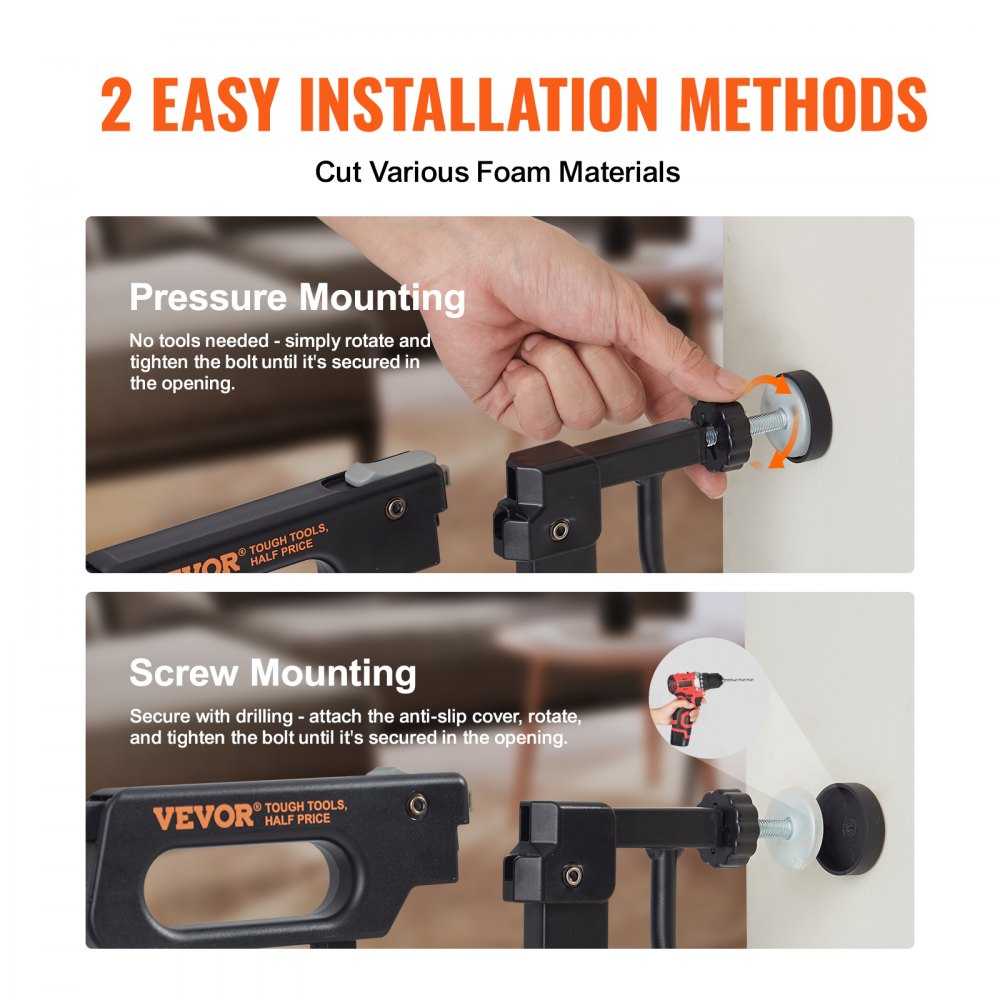 Dva spôsoby inštalácie: Vyberte si medzi tlakovou montážou pre bezproblémovú inštaláciu alebo montážou s kovaním pre mimoriadne bezpečné uchytenie. Detskú zábranu je možné nastaviť len za 10 minút bez poškodenia stien pri tlakovej montáži. A ak sú potrebné schody, zvoľte si kovanie pre špičkovú bezpečnosť.