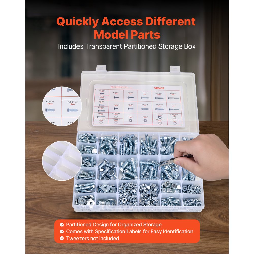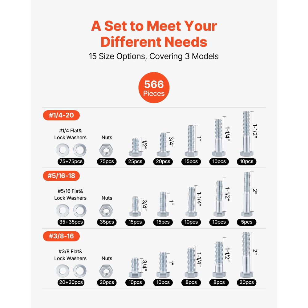 566-dielna sada pre viacero špecifikácií: Táto praktická sada obsahuje palcové skrutky, matice a podložky pre veľkosti #1/4-20, #5/16-18, #3/8-16 (vrátane plochých podložiek a pružných podložiek vo veľkostiach #1/4, #5/16, #3/8) v rôznych dĺžkach.
