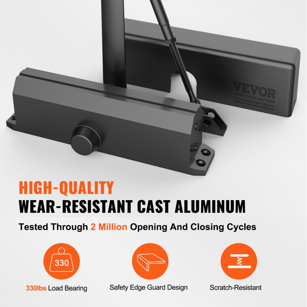 Zatvárač dverí VEVOR, automatický zatvárač dverí na komerčné alebo rezidenčné použitie pre dvere s hmotnosťou 150 kg, nastaviteľná veľkosť, hydraulický nárazníkový zatvárač dverí, odolné telo z liateho hliníka, jednoduchá inštalácia, čierny