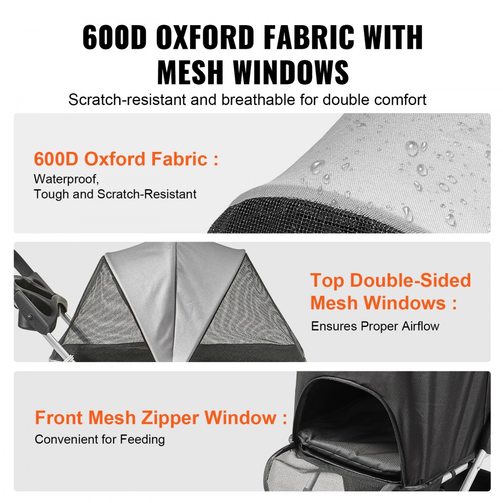 Oxfordská tkanina 600D a sieťované okienka: Odolná oxfordská tkanina 600D odolá okusovaniu domácimi zvieratami, vďaka čomu kočík pre mačky zostane v perfektnom stave. Viaceré priedušné sieťované okienka zaisťujú nerušené prúdenie vzduchu a poskytujú vášmu domácemu miláčikovi široké zorné pole. Priestranný košík kočíka zvyšuje pohodlie vášho domáceho maznáčika.