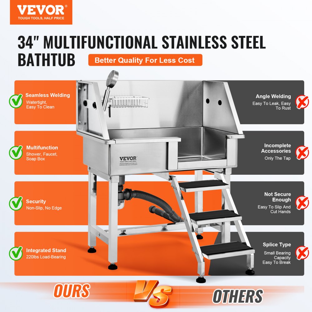 Bezšvový dizajn 34": Naša multifunkčná vaňa pre domáce zvieratá z nehrdzavejúcej ocele sa pýši bezšvovým zvarením pre bezproblémový zážitok. Je ideálna pre majiteľov domácich zvierat a profesionálnych strihačov, ktorí hľadajú bezpečné a bezproblémové riešenie starostlivosti o domáce zvieratá.