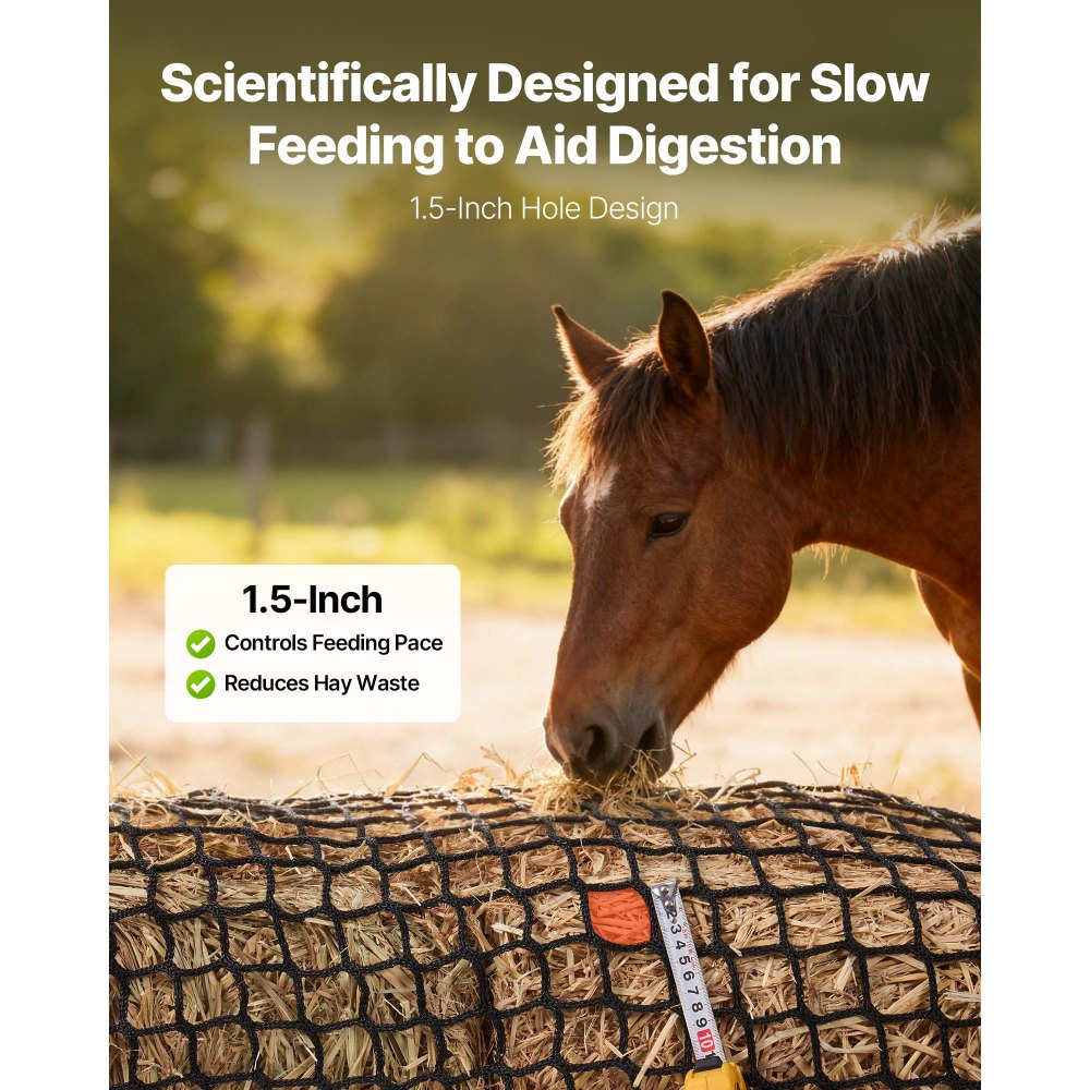 Vedecké pomalé kŕmenie: Táto sieť na pomalé kŕmenie s okrúhlymi balíkmi sena s veľkosťou ôk 1,5 palca napodobňuje prirodzenú pastvu, spomaľuje jedenie, zabraňuje prejedaniu sa a znižuje riziko nadúvania alebo vredov, čím podporuje optimálne trávenie koní.