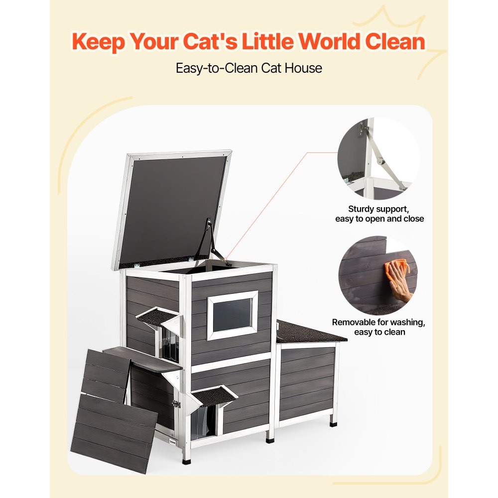 Jednoduché čistenie: Vonkajší prístrešok pre mačky s výklopnou strechou sa otvára pre rýchly prístup, zatiaľ čo odnímateľné podlahové panely uľahčujú dôkladné čistenie. Udržiava prístrešok hygienický a bez zápachu.