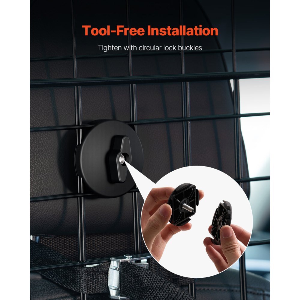 Inštalácia bez náradia: Naša zábrana pre psov do auta je dodávaná s kruhovými zámkami, nylonovými popruhmi a elastickými šnúrami pre bezpečné pripevnenie k opierkam hlavy. Na inštaláciu nie je potrebné žiadne náradie, čo zaisťuje jednoduché nastavenie a pevné, protišmykové držanie.