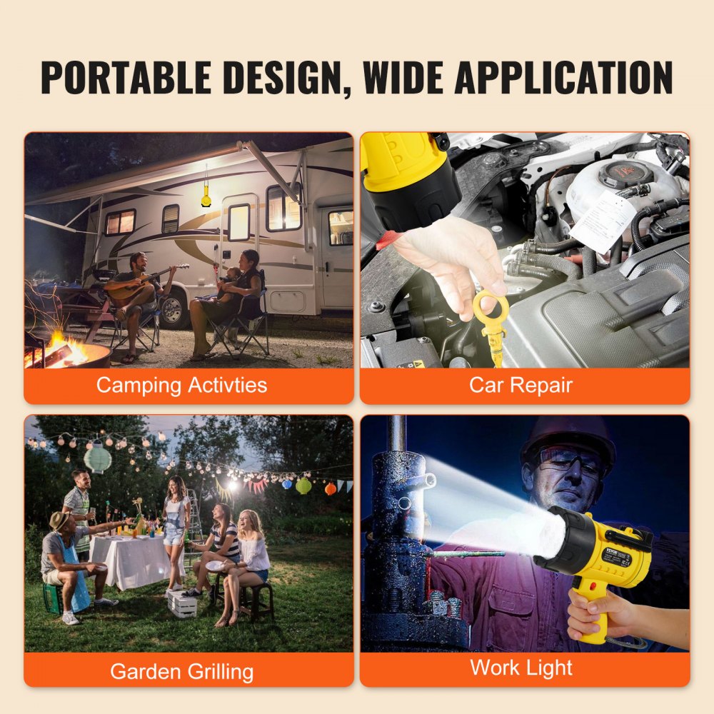 Nabíjateľné reflektorové svietidlo VEVOR, 1 000 000 lúmenov, vodotesné ručné LED bodové svetlo IP67, super jasné prenosné reflektor so 4 režimami, odnímateľným objektívom, USB portom, na poľovníctvo, člnkovanie, kempovanie - Ručné náradie