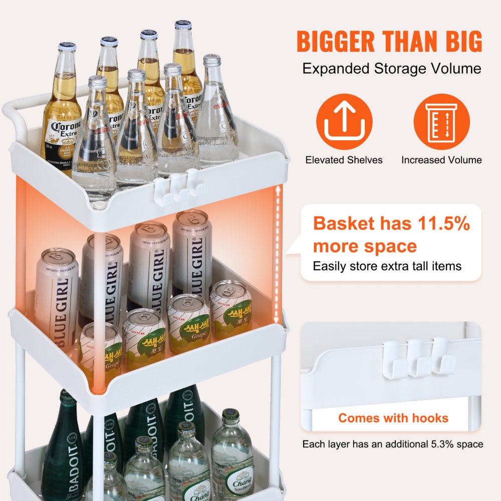 Zvýšená kapacita: Vychutnajte si rozšírený úložný priestor s naším novo vylepšeným vozíkom na kolieskach! Vďaka zvýšenej výške poskytuje každá polica o 5,3 % viac miesta a o 11,5 % viac miesta v koši. Či už ide o objemné predmety alebo drobnosti, môžete si ich uložiť všetko. Navyše, ďalšie háčiky znamenajú viac miesta na zavesenie – to je pohodlie!
