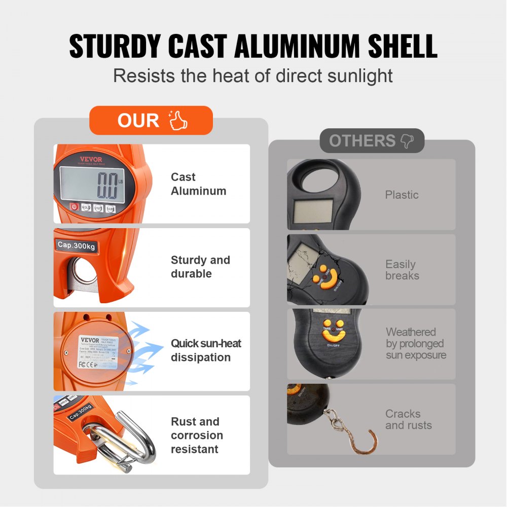 Digitálna žeriavová váha VEVOR, 660 libier/300 kg, priemyselná závesná váha pre vysoké zaťaženie s puzdrom z liateho hliníka a LCD obrazovkou, ručný mini žeriav s hákmi na farmu, poľovníctvo, rybolov, exteriér, garáž (oranžová)