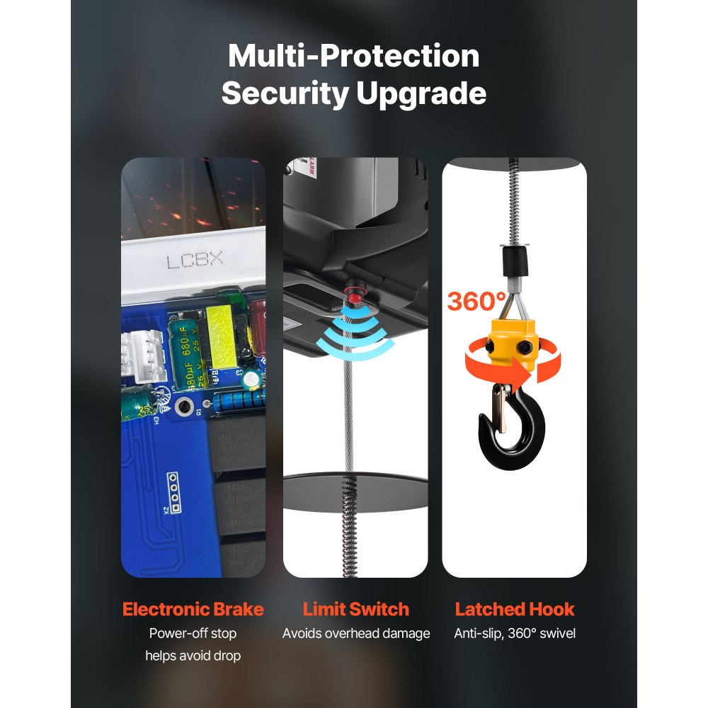 Viacvrstvová bezpečnostná ochrana: Tento elektrický kladkostroj kombinuje elektronické a mechanické brzdy pre spoľahlivé zastavenie. Koncový spínač a 360° západkový hák zvyšujú bezpečnosť a motor sa automaticky zastaví pri výpadku napájania alebo dosiahnutí horného limitu, aby sa predišlo pádom.