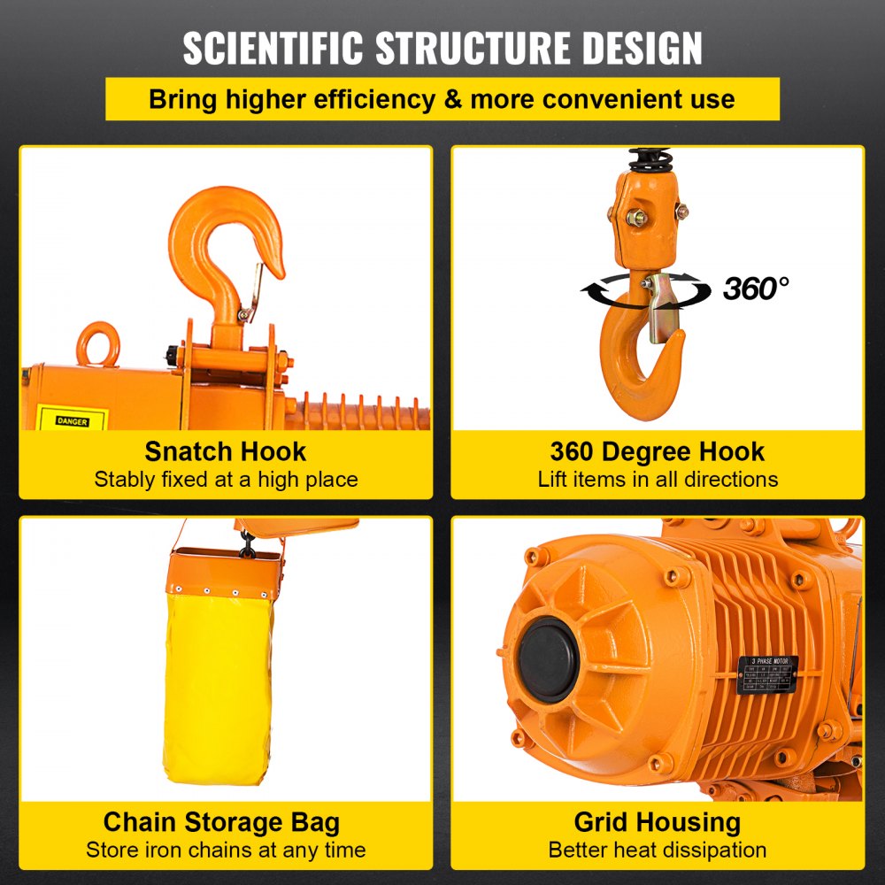 Reťaze G80 a kovaný oceľový hák: Rýchlosť zdvihu: 3,3 m/min. Výška zdvihu: 4,3 m. Elektrický reťazový kladkostroj je vybavený reťazami z mangánovej ocele G80 so zvarovými spojmi a kovanou oceľou z mangánovej ocele s bezpečnostnou západkou. Spodný hák sa môže otáčať o 360 stupňov.