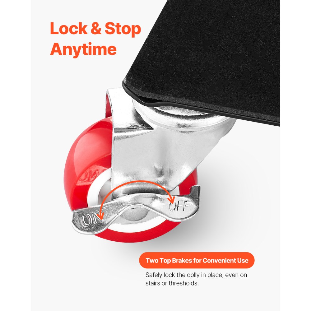 Brzdenie jedným kliknutím: Vďaka dvojitým brzdám jednoduchým zatlačením zablokuje vozík na nábytok na mieste a zabráni tak jeho neúmyselnému pohybu. To zaisťuje bezpečnosť počas prepravy a parkovania, čo vám umožňuje dočasne položiť nábytok, aby ste otvorili dvere alebo vybrali iné predmety.