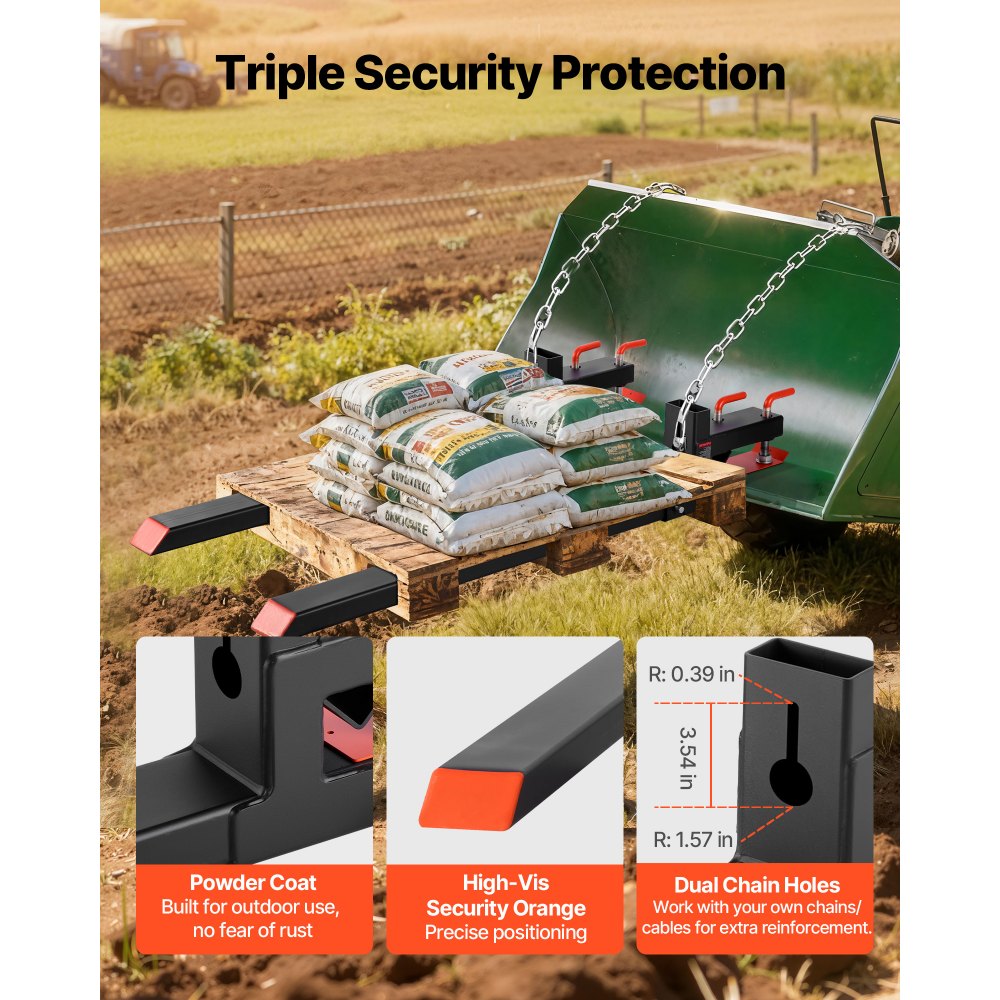 Detaily kvality: Oceľ Q235B a práškovo lakovaná povrchová úprava našich paletových vidlíc odolávajú náročnému vonkajšiemu použitiu. Dva otvory pre reťaze podporujú dodatočné upevnenie, zatiaľ čo jasne oranžové hroty zvyšujú viditeľnosť.