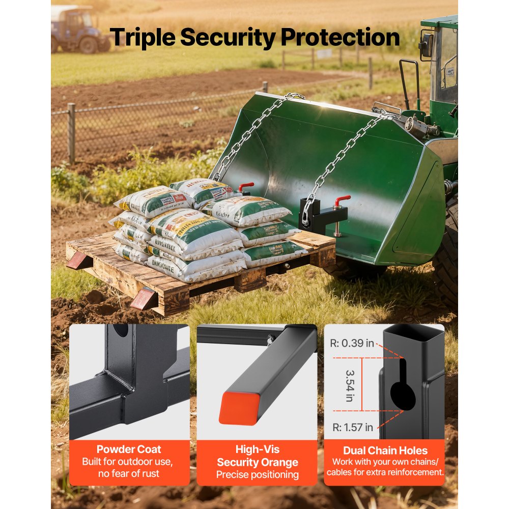 Detaily kvality: Oceľ Q235B a práškovo lakovaná povrchová úprava našich paletových vidlíc odolávajú náročnému vonkajšiemu použitiu. Dva otvory pre reťaze podporujú dodatočné upevnenie, zatiaľ čo jasne oranžové hroty zvyšujú viditeľnosť.