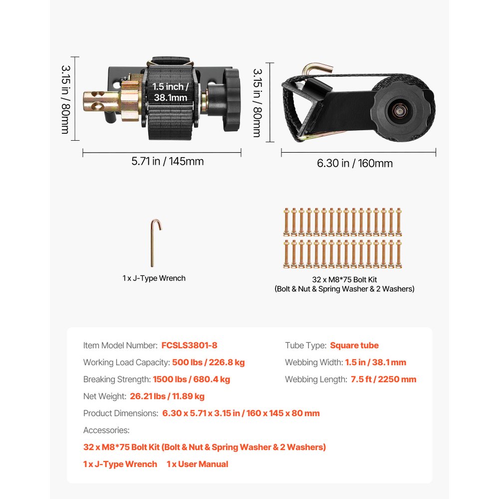 Popruhy na rebríkový nosič VEVOR s račňovým uchytením, čierny štvorcový trubkový držiak, šírka 38 mm x dĺžka 2,25 m, čierne popruhy na rebríkový nosič s dvojitými J-hákmi, nosnosť 226,8 kg, uzamykateľný popruh s prackou (8 ks) - Skladovacie a manipulačné zariadenia
