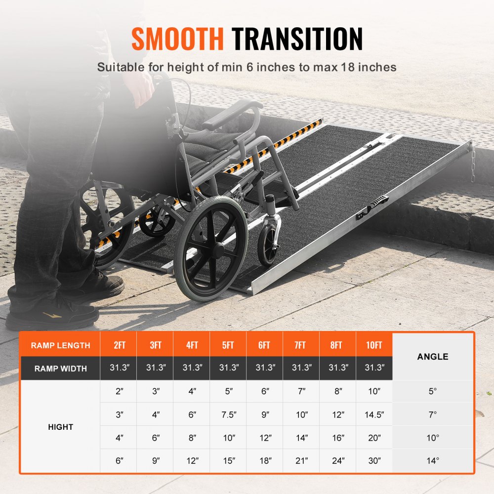 800 libier Vysoká nosnosť: Vďaka pôsobivej nosnosti až 800 libier/363 kg poskytuje naša prenosná rampa pre handicapovaných bezkonkurenčnú stabilitu. Jeho protišmykový povrch zaisťuje trakciu aj v daždivých dňoch alebo na klzkom povrchu a poskytuje vám pokoj a bezpečnosť, nech ste kdekoľvek.
