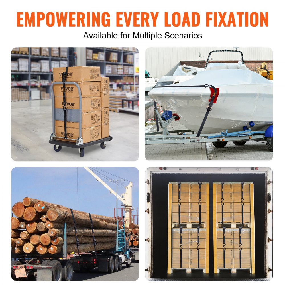Všestranné použitie: Račňové popruhy VEVOR poskytujú odolné a spoľahlivé zabezpečenie pri preprave rôznych malých a veľkých predmetov vrátane motocyklov, kanoí, kajakov, štvorkoliek, krabíc, lodí, nábytku, záhradnej techniky, ťažkých strojov a iného nákladu na korbách nákladných vozidiel, prívesoch alebo strešných nosičoch.