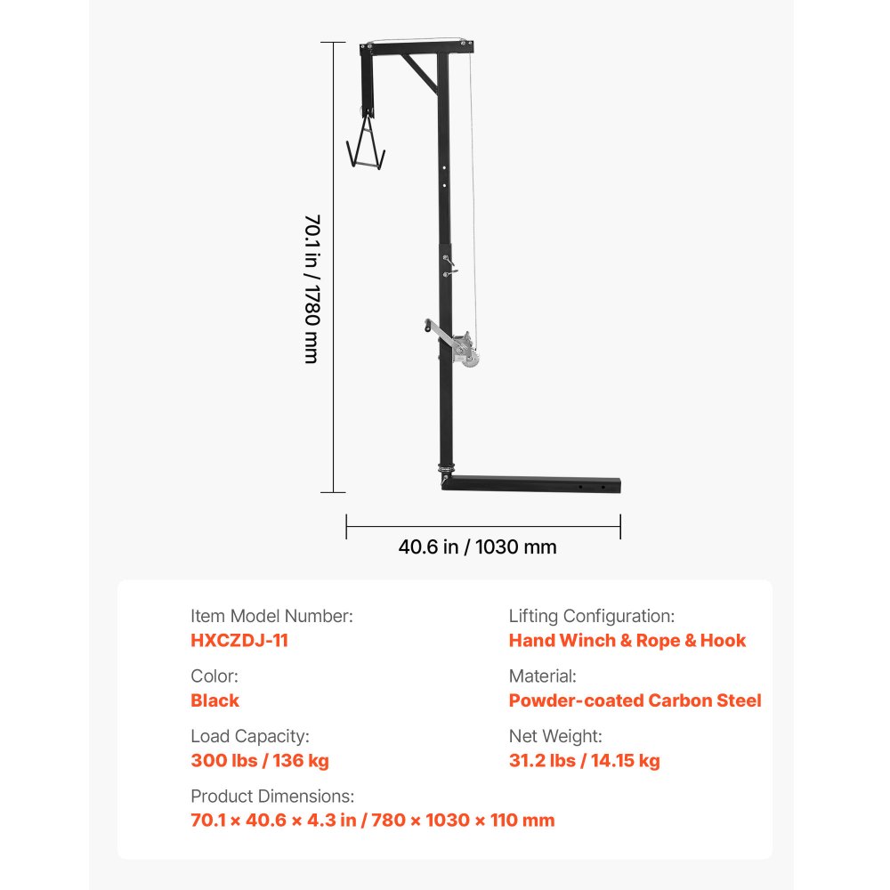 Zdvihák na lov jeleňov VEVOR pre ťažné zariadenie nákladných vozidiel, nosnosť 136 kg, poľovnícky zdvihák na jelene s 2-palcovým prijímačom, otočný hriadeľ o 360 stupňov a nastaviteľná výška, vrátane navijaka na sťahovanie a čistenie zveri