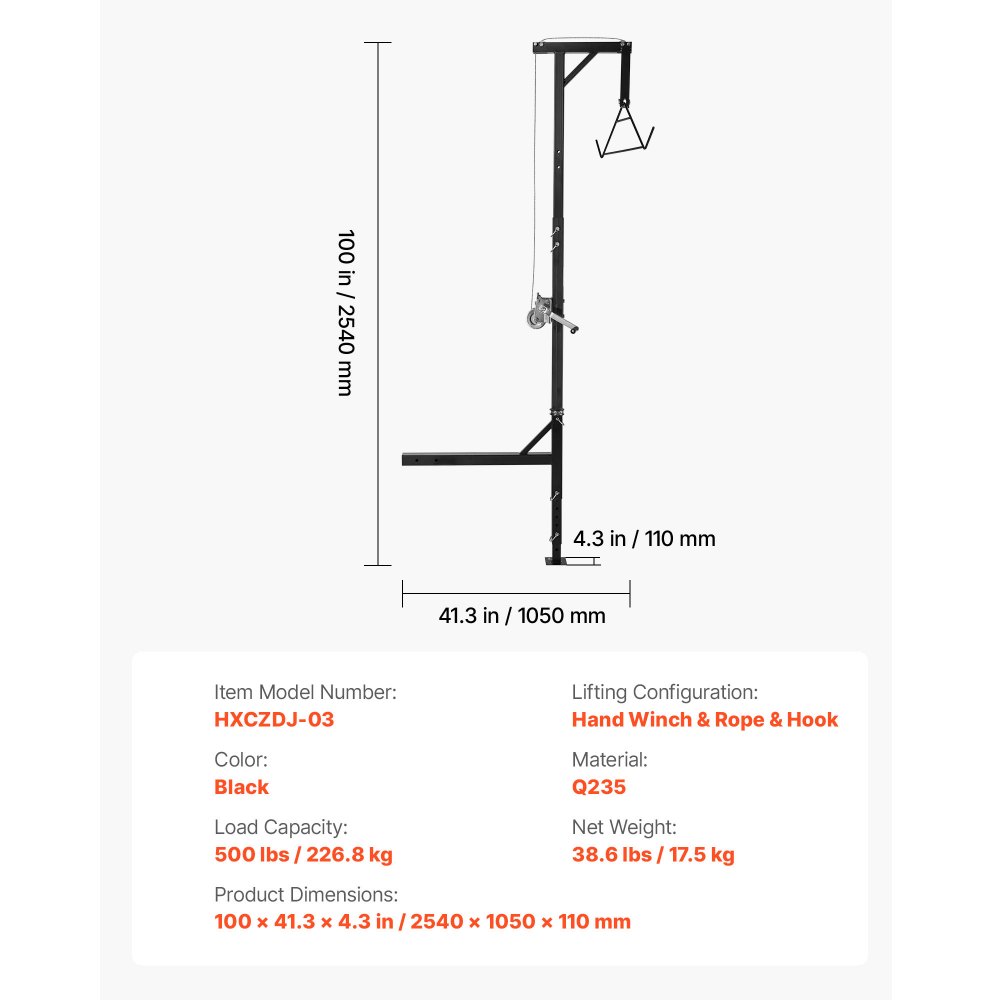 Zdvihák na lov jeleňov VEVOR pre ťažné zariadenie nákladných vozidiel, nosnosť 500 libier, poľovnícky zdvihák na jelene s 2-palcovým prijímačom, otočný hriadeľ o 360 stupňov a nastaviteľná výška, vrátane navijaka na sťahovanie a čistenie zveri