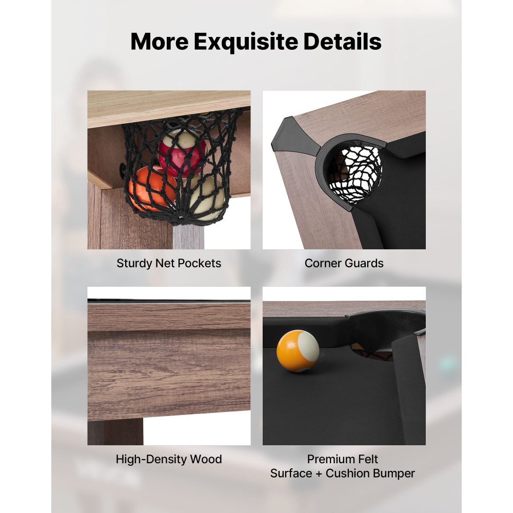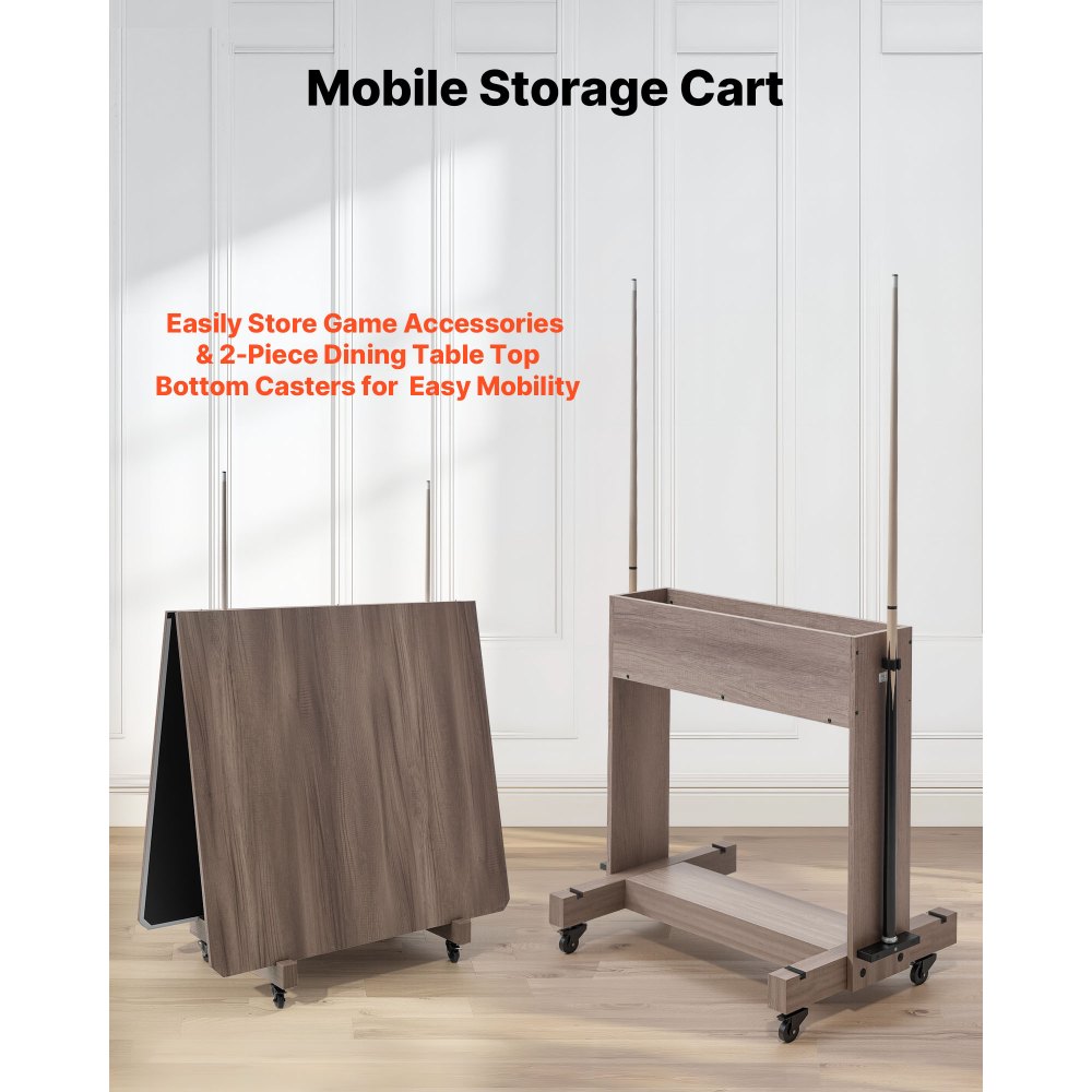 Herný stôl 3 v 1: Tento biliardový stôl kombinuje biliardový, jedálenský a pingpongový stôl do jednej kompaktnej jednotky. Obojstranná jedálenská doska slúži aj ako povrch na stolný tenis alebo sa dá úhľadne uložiť na kolieskovej police pre okamžitý prístup k súťažnej hre biliardu.