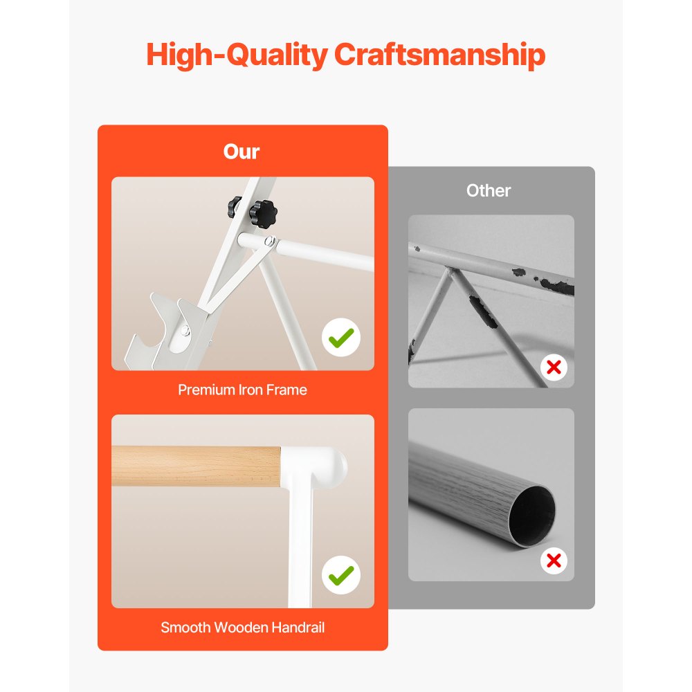 Vysokokvalitný materiál: Táto baletná tyč je vyrobená z prvotriedneho oceľového rámu a hladkého dreveného madla a je vybavená upevňovacími prvkami s nosnosťou až 113 kg. Protišmykové opierky na nohy zaisťujú stabilitu. Madlo má koncové krytky, ktoré poskytujú dlhšiu šírku.