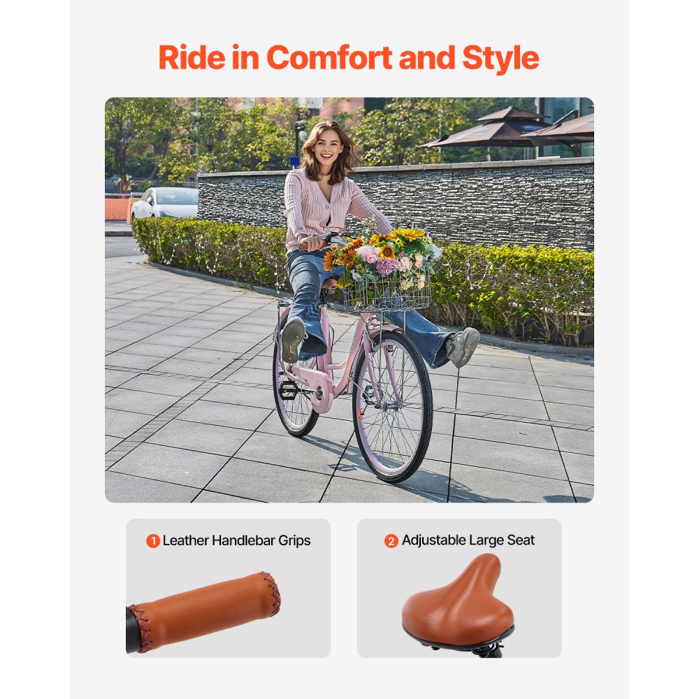 Bicykel VEVOR Cruiser, 1-rýchlostný, 26-palcový ružový plážový bicykel s veľkoobjemovým košíkom a zadným nosičom, bezpečný a robustný bicykel s nastaviteľným sedadlom, vhodný na cyklistiku, cvičenie a nakupovanie. - Šport a rekreácia