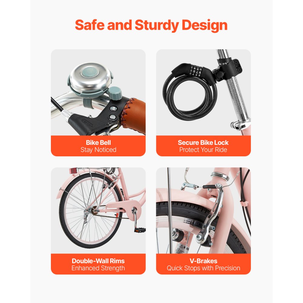 Odolný a spoľahlivý: Tento cruiserový bicykel je vyrobený z rámu z vysoko uhlíkovej ocele a odoláva každodennému opotrebovaniu a nárazom. Predné a zadné brzdy V-brzdy zaisťujú silný brzdný účinok, zatiaľ čo dvojvrstvové ráfiky zvyšujú odolnosť. Pre väčšiu bezpečnosť a pohodlie je vybavený odrazkami, blatníkmi, zvončekom a kombinovaným zámkom.