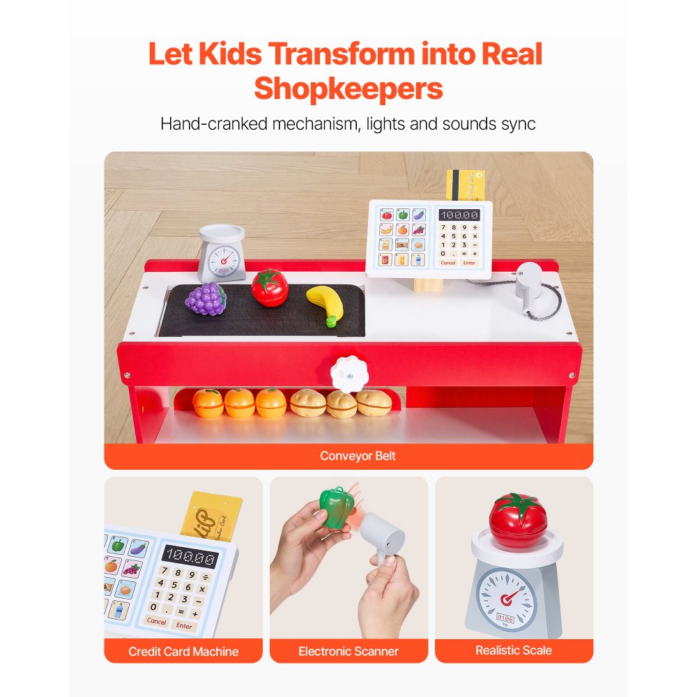 Interaktívne funkcie: Náš obchod s potravinami na hranie je vybavený pohyblivým dopravníkovým pásom, skenerom a čítačkou kariet. Deti tak môžu skenovať ovocie, zeleninu a platiť za pokladňu rovnako ako v skutočnom obchode.