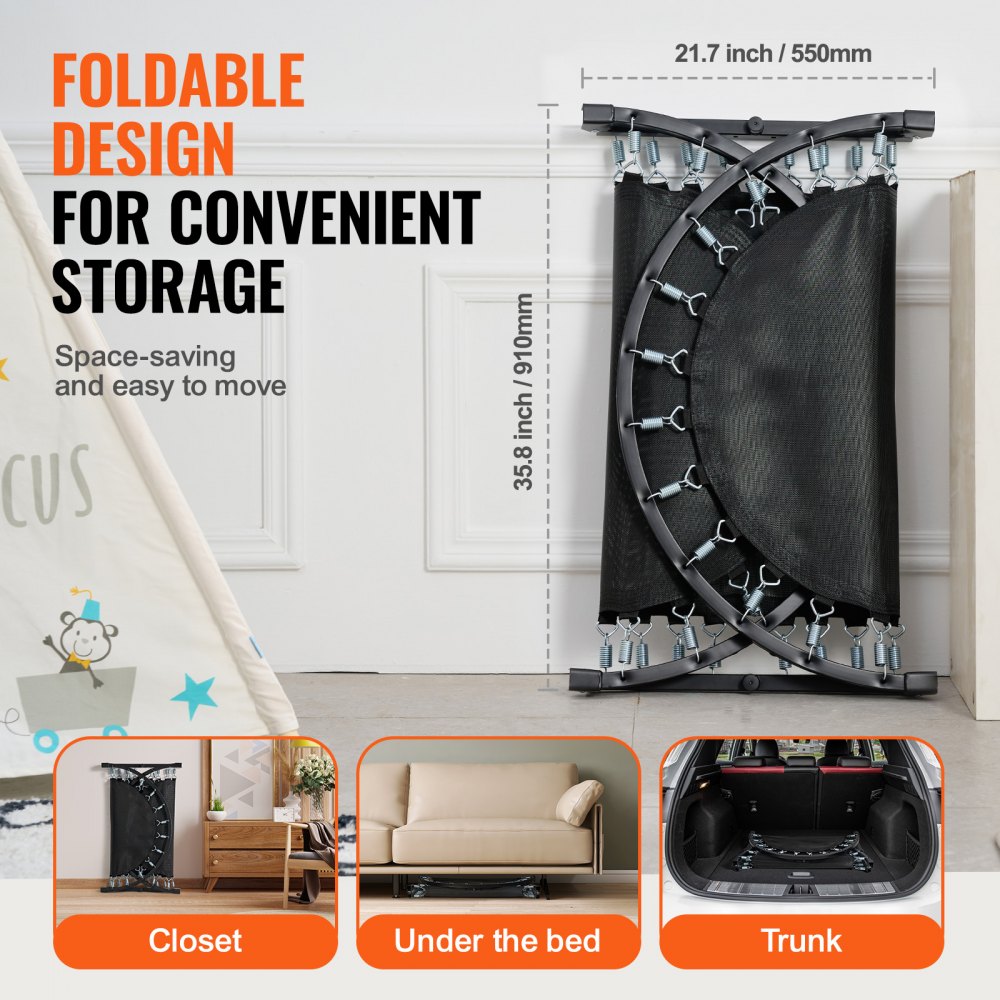 Rýchle skladovanie vďaka skladaciemu dizajnu: Vďaka skladaciemu rámu zaberá naša mini trampolína pre batoľatá po zložení iba tretinu svojho pôvodného objemu, čo uľahčuje skladovanie a šetrí miesto. Dá sa schovať pod pohovku alebo do kufra auta. Skladací dizajn tiež uľahčuje premiestňovanie, čo deťom umožňuje skákať, kam chcú.