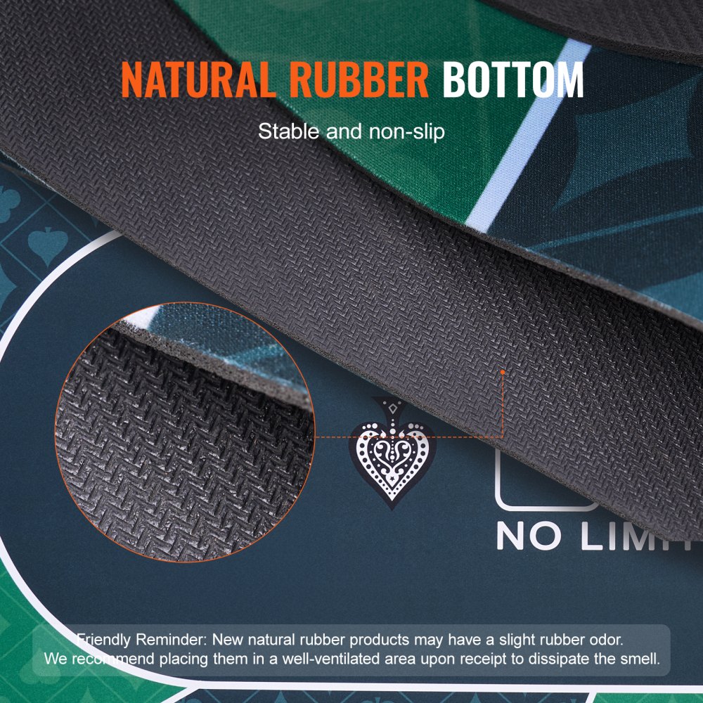 Vynikajúce remeselné spracovanie a vysoká odolnosť: Naša podložka pod pokrový stôl je vyrobená z prírodného kaučuku s vysokou hustotou a prémiovej látky s hrúbkou 3 mm, čo zaisťuje vynikajúcu odolnosť a zabraňuje pokrčeniu pri rozložení naplocho pri kartových hrách. Či už hráte doma alebo v pokrovej herni, pevne priľne k doske stola a udržiava stabilitu pre pohodlný zážitok z hrania kariet.