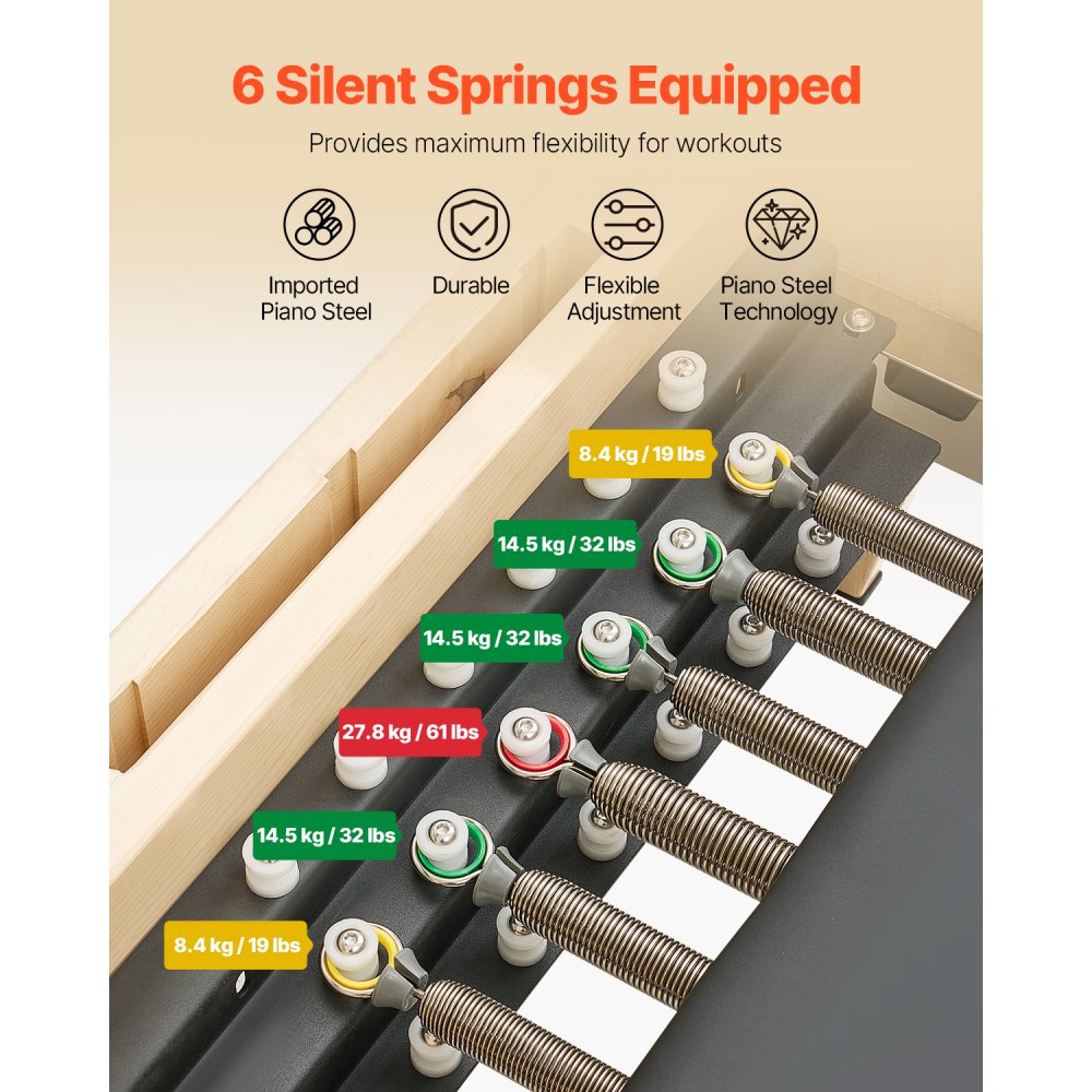 Prémiové pružiny: Toto domáce pilates zariadenie používa vysoko kvalitné dovážané pružiny z klavírnej ocele, ktoré poskytujú 6 úrovní odporu pružiny pre posilnenie hornej časti tela, dolnej časti tela a svalov jadra. Sada obsahuje 1 silnú pružinu (červená), 3 stredné pružiny (zelené) a 2 ľahké pružiny (žlté).