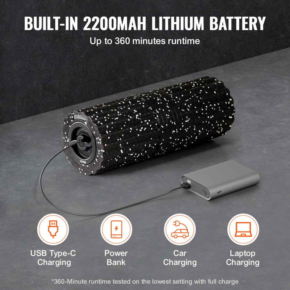 Bezproblémové nabíjanie cez USB: Koniec s chaotickými káblami! Tento elektrický vibračný penový valec má batériu s kapacitou 2200 mAh a nabíjanie cez USB typu C. S výdržou až 360 minút na jedno nabitie zostanete nabití, či už doma, v posilňovni alebo na cestách.