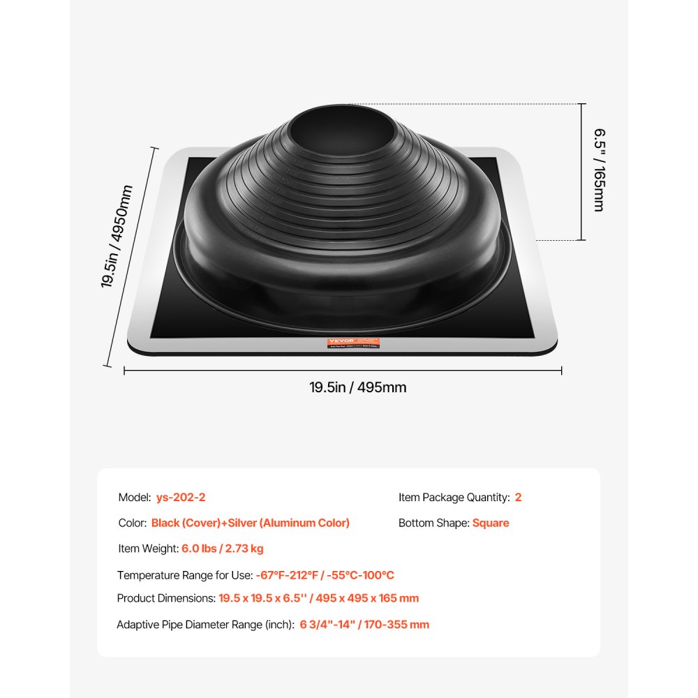 Flexibilný dizajn, manipulácia s rúrami rôznych veľkostí: Táto sada na oplechovanie strešných rúr obsahuje 2 čierne štvorcové EPDM tesnenia, každé s rozmermi 19,5'' x 19,5'' x 6,5''. Vhodné pre priemery rúr od 6-3/4" do 14" a dajú sa bez námahy narezať na požadovanú veľkosť!