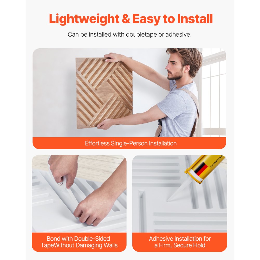 3D nástenné panely VEVOR, balenie 12 kusov, moderné umelecké minimalistické soľné dlaždice z PVC s rozmermi 19,7 x 19,7 palca, pokrytie 32 štvorcových stôp, akcentový nástenný panel, interiérová dekorácia do stropu, spálne, obývačky a herne, farba svetlého dreva - Stavebníctvo a konštrukcie