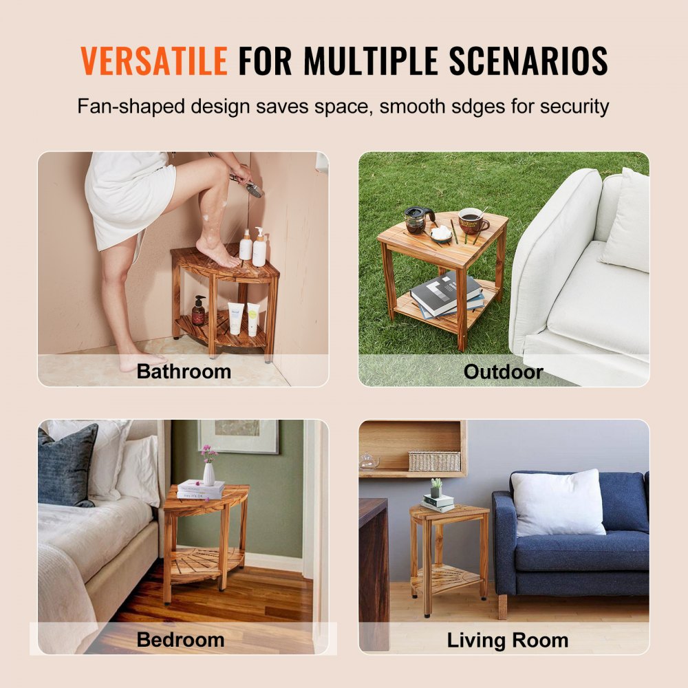 Rohová sprchová lavica VEVOR z teakového dreva, výška 46,5 cm, polomer 39,5 cm, 100 % teakové drevo, rohová sprchová stolička, odolná voči plesniam, nosnosť 227 kg s odkladacou poličkou, do kúpeľne