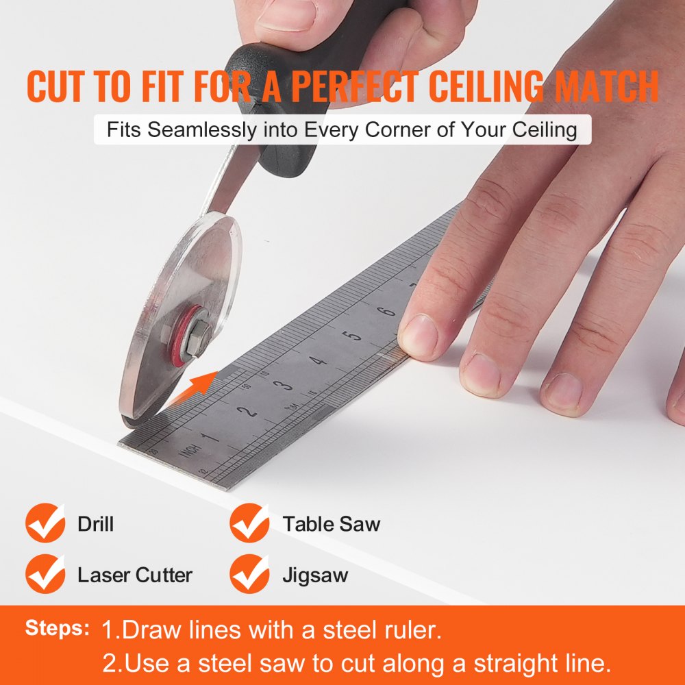 Prispôsobiteľné rezanie: Dlaždice môžete jednoducho rezať stolovou pílou, priamočiarou pílou, vŕtačkou alebo laserovým rezačom, aby sa zmestili do akéhokoľvek rohu vášho stropu. Dosiahnete tak dokonalé prispôsobenie pre každý roh a hranu, čím zabezpečíte bezproblémový vzhľad v celej miestnosti.