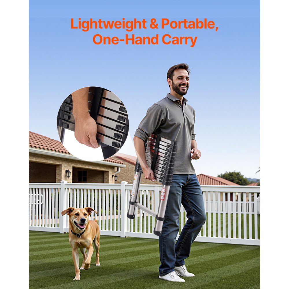 Teleskopický rebrík VEVOR, ľahký výsuvný rebrík z nehrdzavejúcej ocele s dĺžkou 3740 mm, viactlačidlové skladacie rebríky, nosnosť 150 kg a protišmykové nožičky, prenosné 13-stupňové rebríky do podkrovia obytného prívesu.