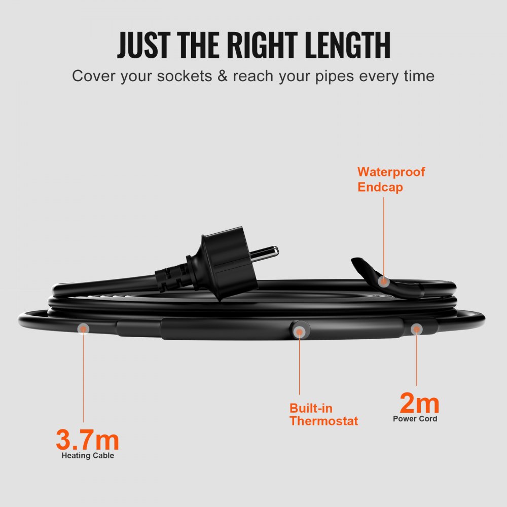 Samoregulačný vykurovací kábel VEVOR na potrubie, 3,7 m, 16,4 W/m, tepelná páska na potrubie, ochrana proti zamrznutiu, vykurovací kábel pre vodovodné potrubie so vstavaným termostatom chráni PVC hadicu, kovové a plastové potrubie pred zamrznutím
