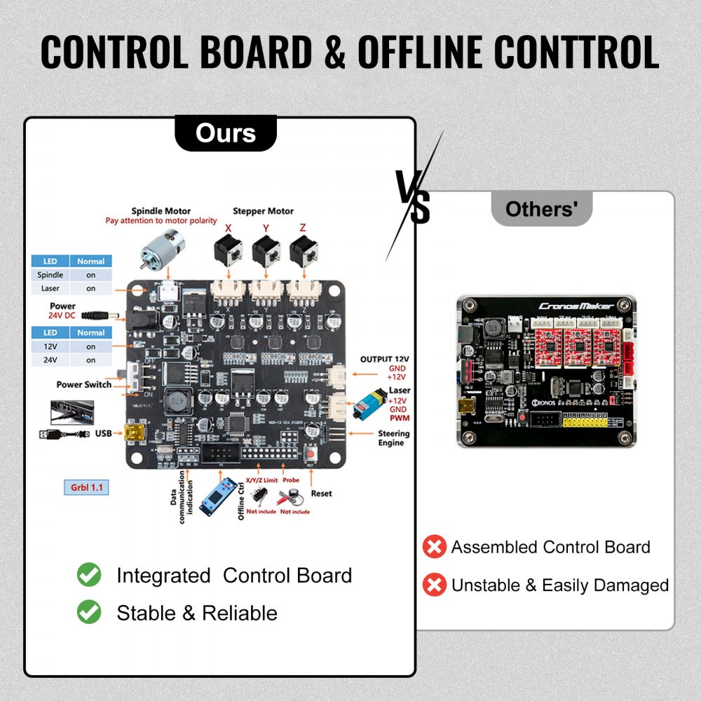 Vylepšená riadiaca doska: Integrované ovládanie GRBL ponúka plnú funkčnosť a stabilitu. Výhody offline ovládača spočívajú v nasledujúcich: 1. Nie je potrebné pripojenie k počítaču; 2. Ľubovoľný výber offline súborov na gravírovanie. 3. Ručne nastavte polohu osí X, Y a Z ako počiatočný bod gravírovania, ručne zapnite alebo vypnite vreteno.4. Vysoká presnosť: menej ako 0,003 palca.