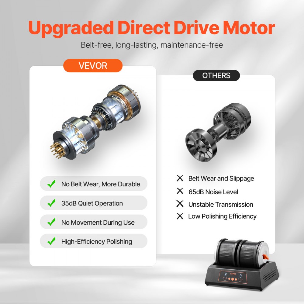 Bezremeňový motor s priamym pohonom: Už žiadne starosti s pretrhnutými remeňmi! Motor s priamym pohonom poskytuje efektívny výkon s tichou prevádzkou 35 dB. Kameňový bubon sa chladí aj po dlhšom používaní, čo zaisťuje dlhšiu životnosť pre nekonečnú zábavu s kameňovým bubnom.