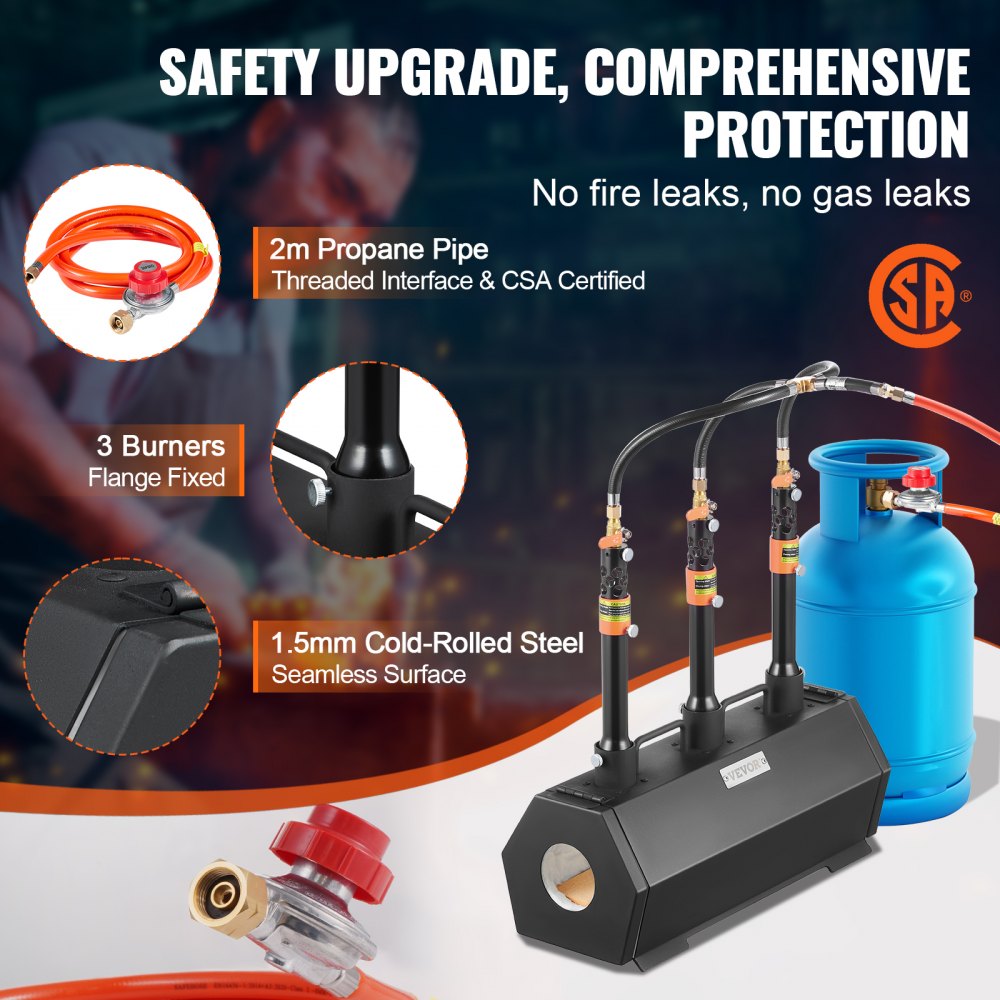 Vylepšené remeselné spracovanie a bezpečnosť: Telo propánovej pece je vyrobené z 1,5 mm čiernej práškovo lakovanej ocele valcovanej za studena s bezšvíkovým vonkajším povrchom. Vylepšené horáky s prírubami a nitmi zaisťujú odolnosť a zabraňujú riziku úniku plynu. Pre zvýšenú bezpečnosť bola propánová hadica s certifikátom CSA vylepšená z tradičných svoriek na závitové spoje, čím sa zabezpečí, že nedochádza k úniku plynu.