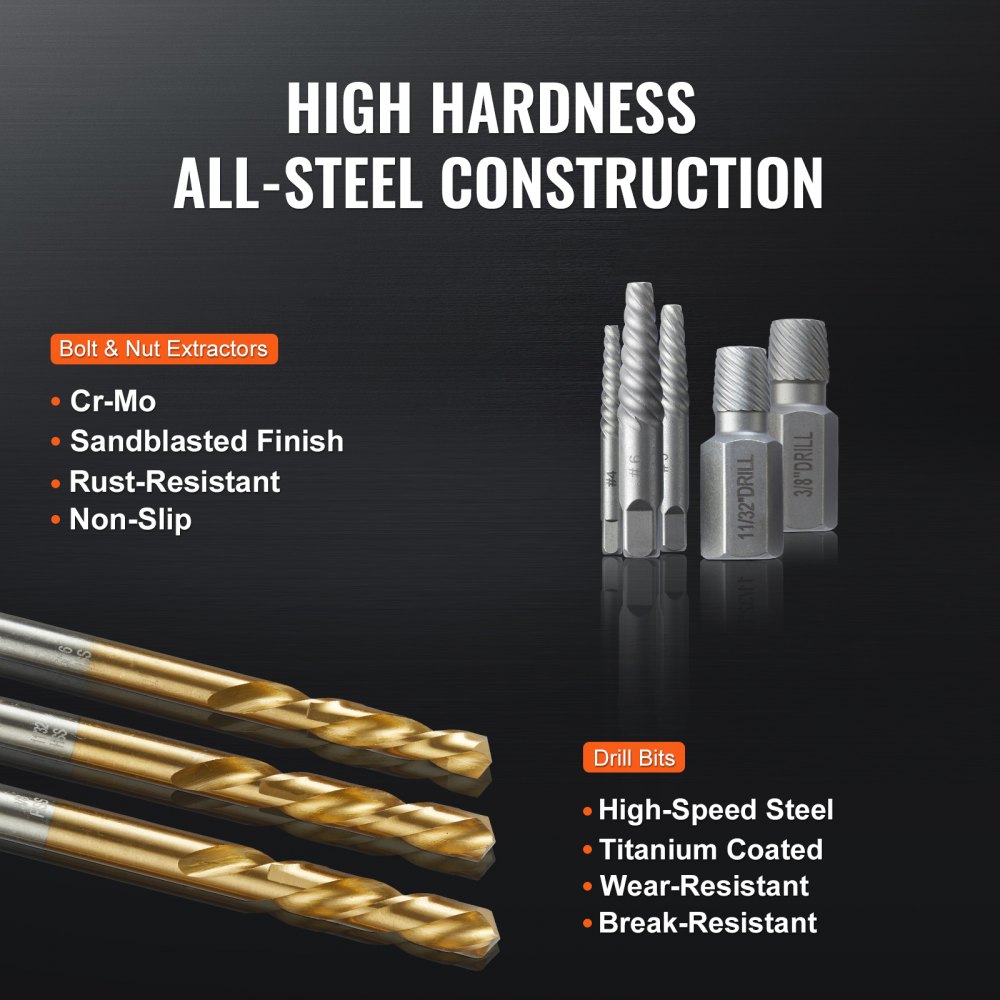 Vyťahovač skrutiek VEVOR so sadou vrtákov, 35-dielna súprava vyťahovačov skrutiek, 19 ks vyťahovačov skrutiek a 16 ks reverzných HSS vrtákov, s úložným puzdrom, na odstraňovanie poškodených skrutiek, matíc a matíc