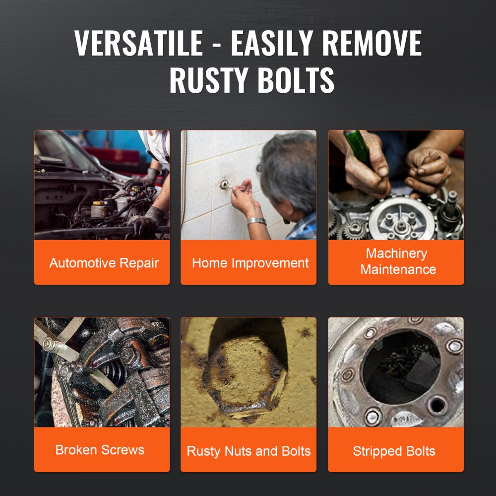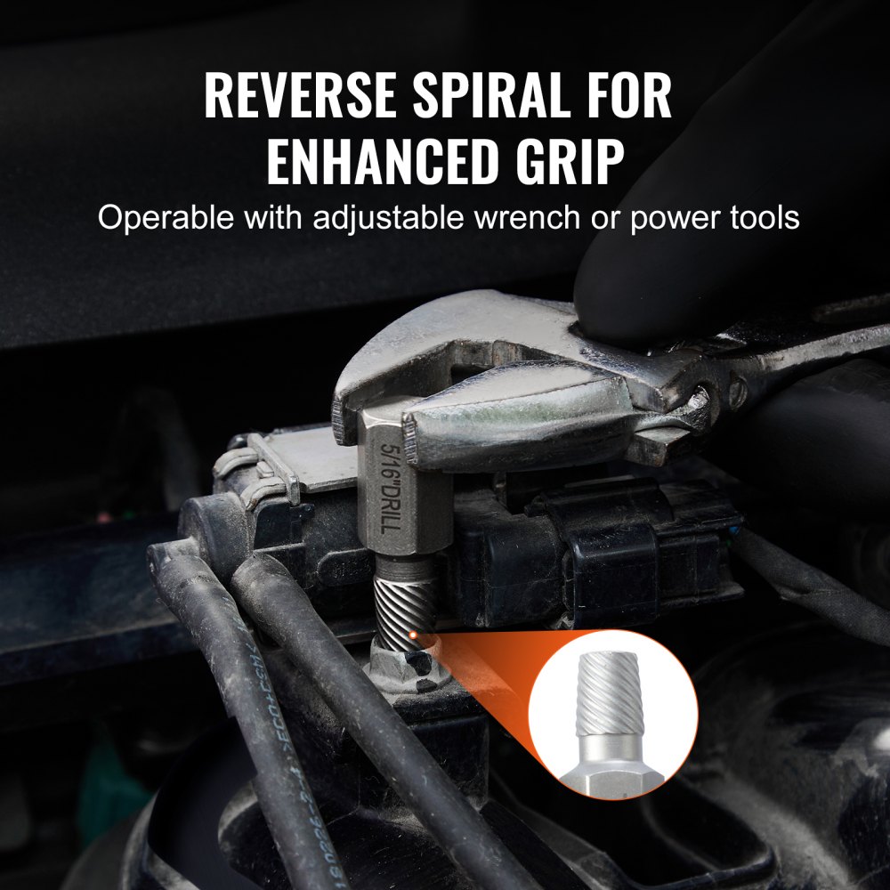 Protišmykový dizajn: Súprava vyťahovačov má obrátenú špirálovú konštrukciu, ktorá bezpečne uchopí závity, aby sa zabránilo skĺznutiu alebo uvoľneniu počas prevádzky. Na efektívne a rýchle odstránenie zlomených alebo strhnutých skrutiek môžete s istotou používať nastaviteľné kľúče, elektrické náradie, račne a ďalšie.