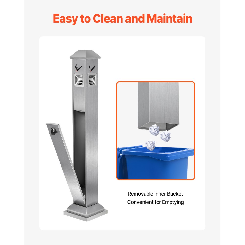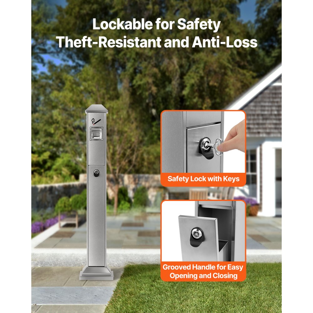 Odolný voči poveternostným vplyvom a bezpečný: Vrchná vrstva odolná voči dažďu udrží všetko suché a čerstvé, zatiaľ čo vstavaný bezpečnostný zámok a zapustená rukoväť uľahčujú údržbu a zabraňujú krádeži. Táto nádoba na ohorky cigariet je navrhnutá tak, aby vaše prostredie bolo bezpečné a upratané bez ohľadu na počasie.