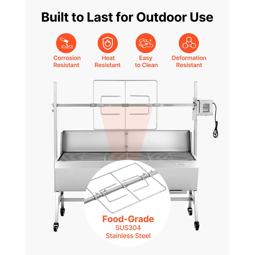 Stabilná kapacita grilu: S kapacitou 60 kg si tento gril na rožni ľahko poradí s celými prasatami (rošt s hmotnosťou 7,5 kg). Jeho ražeň s rozmermi 1218 mm a priestranná grilovacia plocha s rozmermi 1218 × 480 mm umožňujú grilovanie mäsa a zeleniny pre nezabudnuteľnú hostinu vonku.