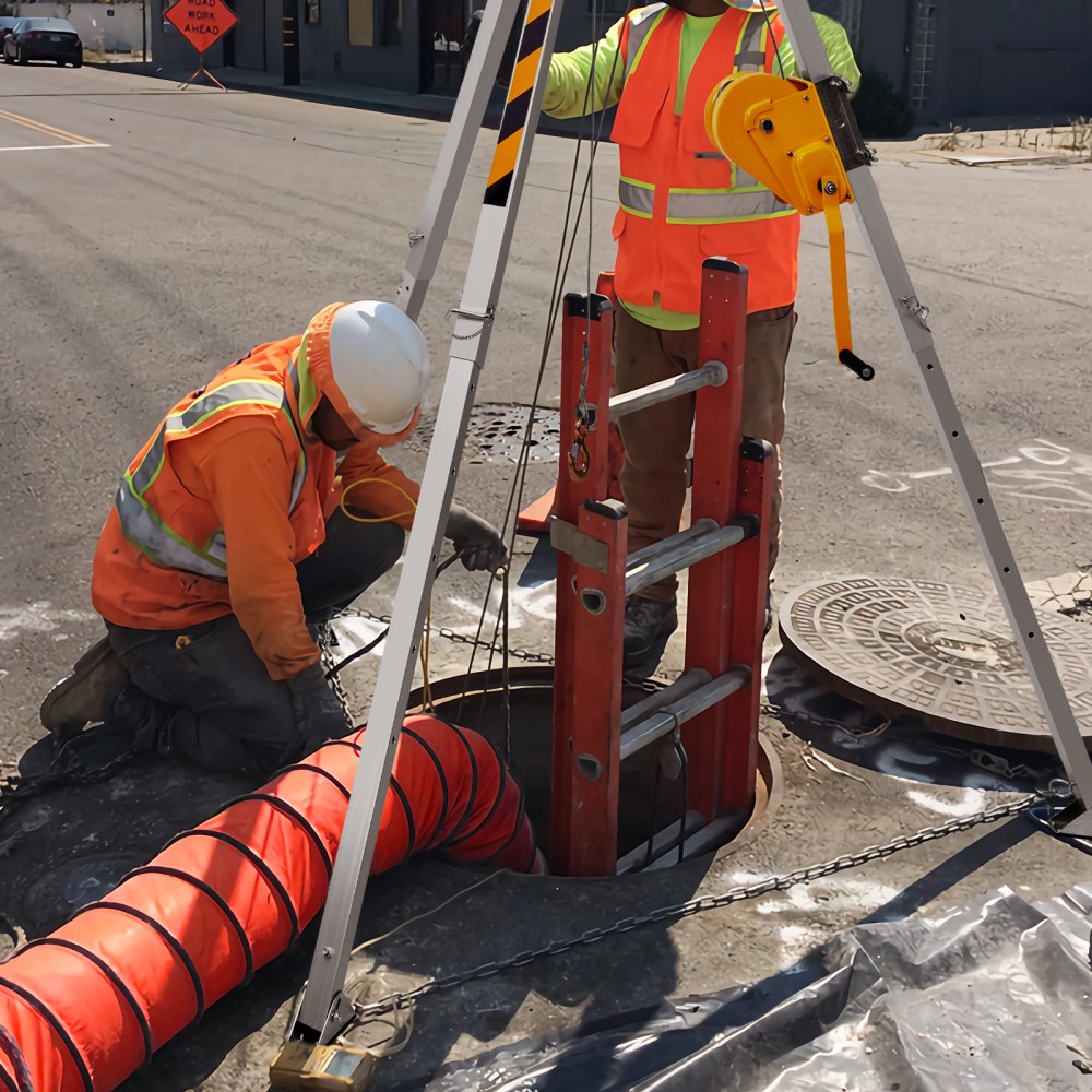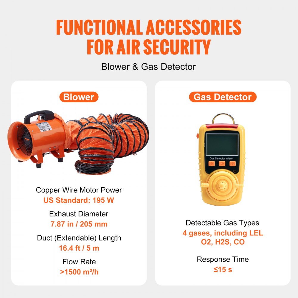 Monitorovanie ventilácie a plynu: Náš statív na záchranu v obmedzenom priestore je dodávaný s ventilátorom poháňaným medeným motorom. S 205 mm výfukovým otvorom, 5 m potrubím a prietokom 1 500 m³/h zaisťuje špičkovú ventiláciu. Detektor plynu monitoruje 4 typy plynov – LEL, O2, H2S a CO – s dobou odozvy ≤15 s, čím zvyšuje bezpečnosť vašej pracovnej zóny.